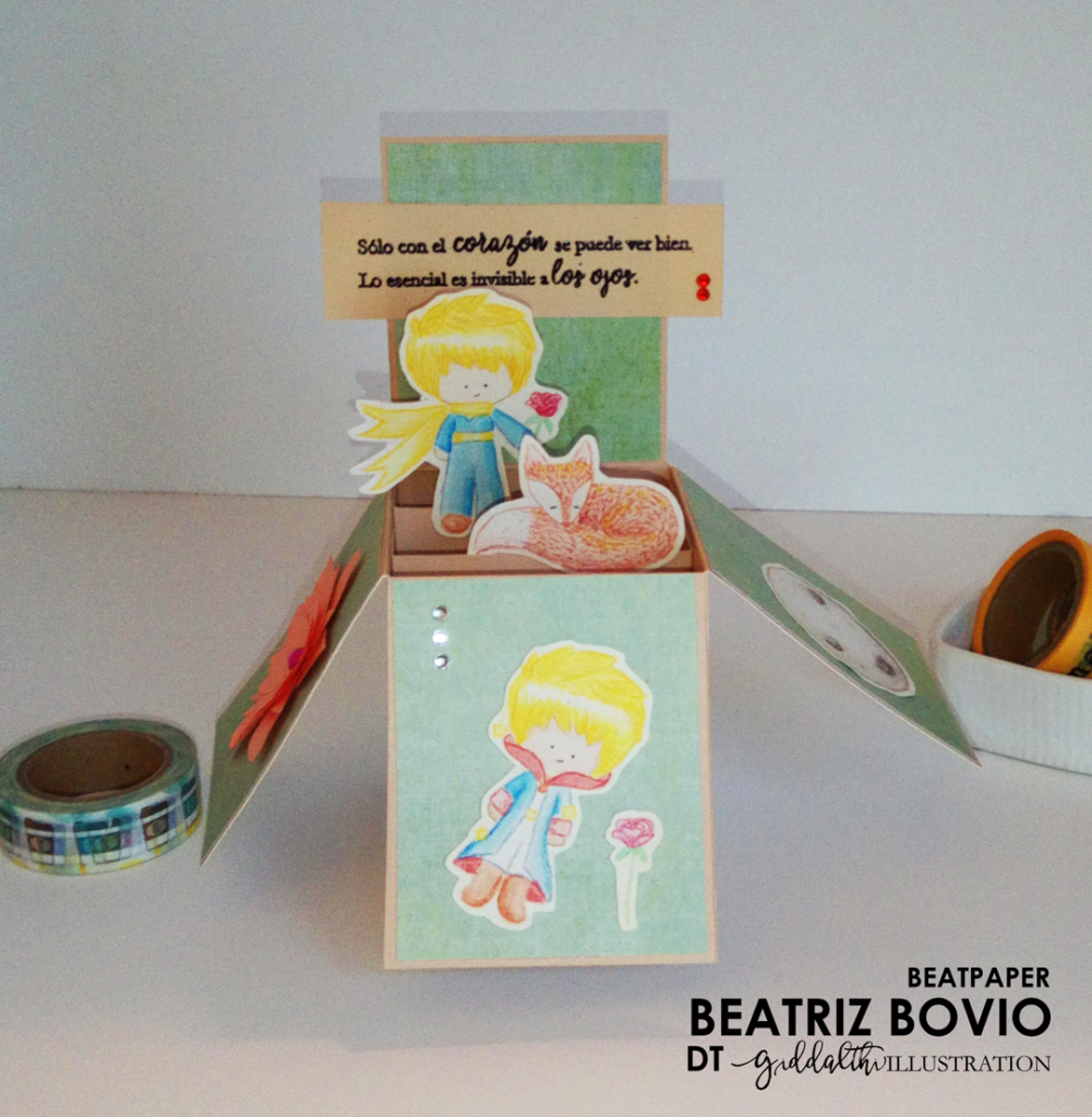 En un inicio tenía ganas de hacer algo interactivo, pero luego recordé que el principito es para admirar y recordar sus enseñanzas, así que una box card que decore un escritorio era lo ideal.