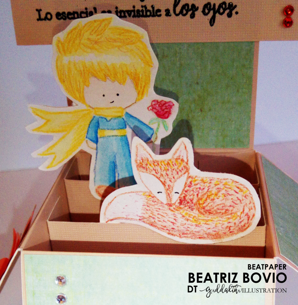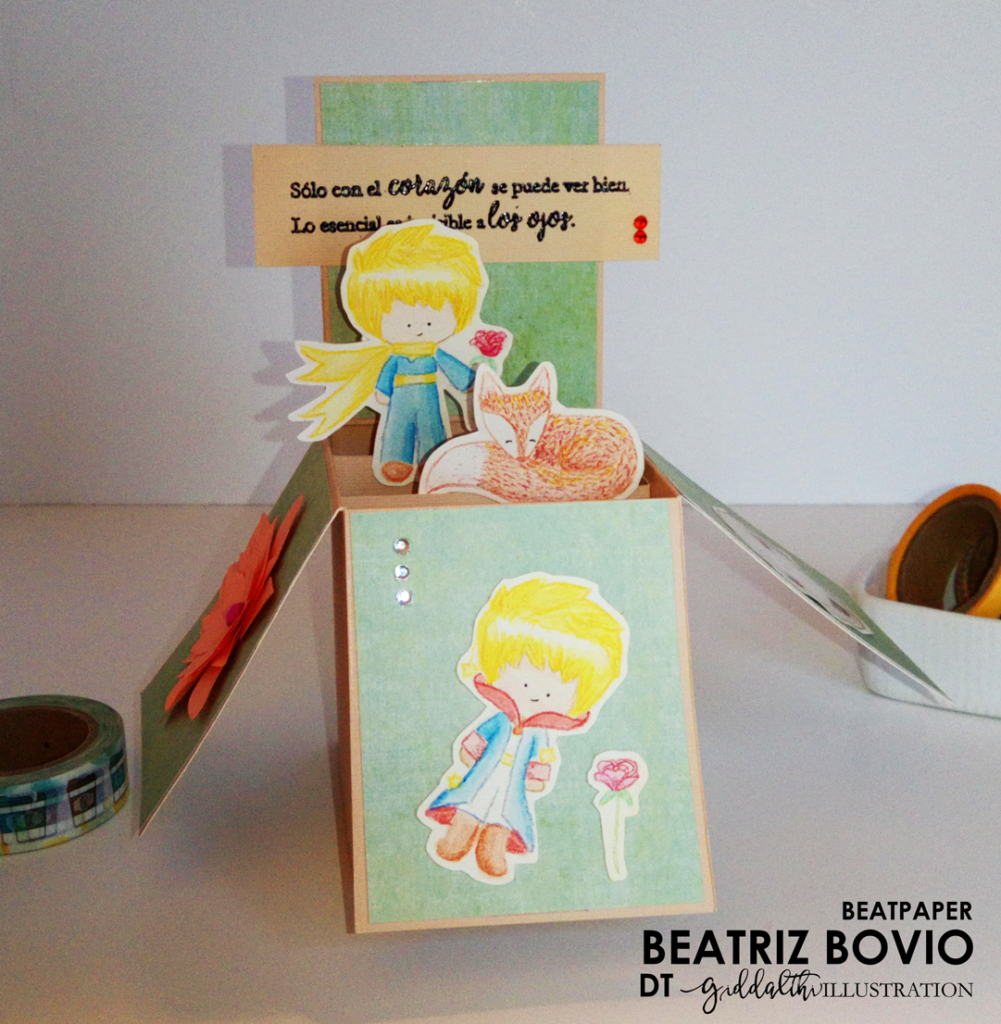 Ya que tenía todo coloreado recorte los sellos para tener los tamaños y diseños a usar. Busque entre mis acumulaciones de papeles una base que combinara con los trajes de el Principito, recorte mi base y el papel decorado para la tarjeta. Y pegue los diseños a la caja buscando acomodarlos al centro para poder verlos todo el tiempo. Con tinta de embosar selle la frase en embossing negro y decore con una flor grande a un lado de la caja.