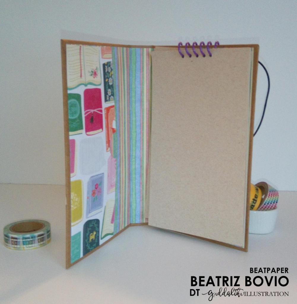 Con los diseños de los sellos coloreados, me dedique a cortar la base del album con cartulina gruesa y forrarlo con un papel café kraft. Use un papel hermoso que compré en Mundo Craft hace poco y que ahora que lo use necesito otro por cierto que los libritos se ven hermosos. Corte algunas hojas y con elástico y eyelets cree el cierre del album. Arme la libreta en la base y le puse un sobre en el interior para tarjetas o fotos.